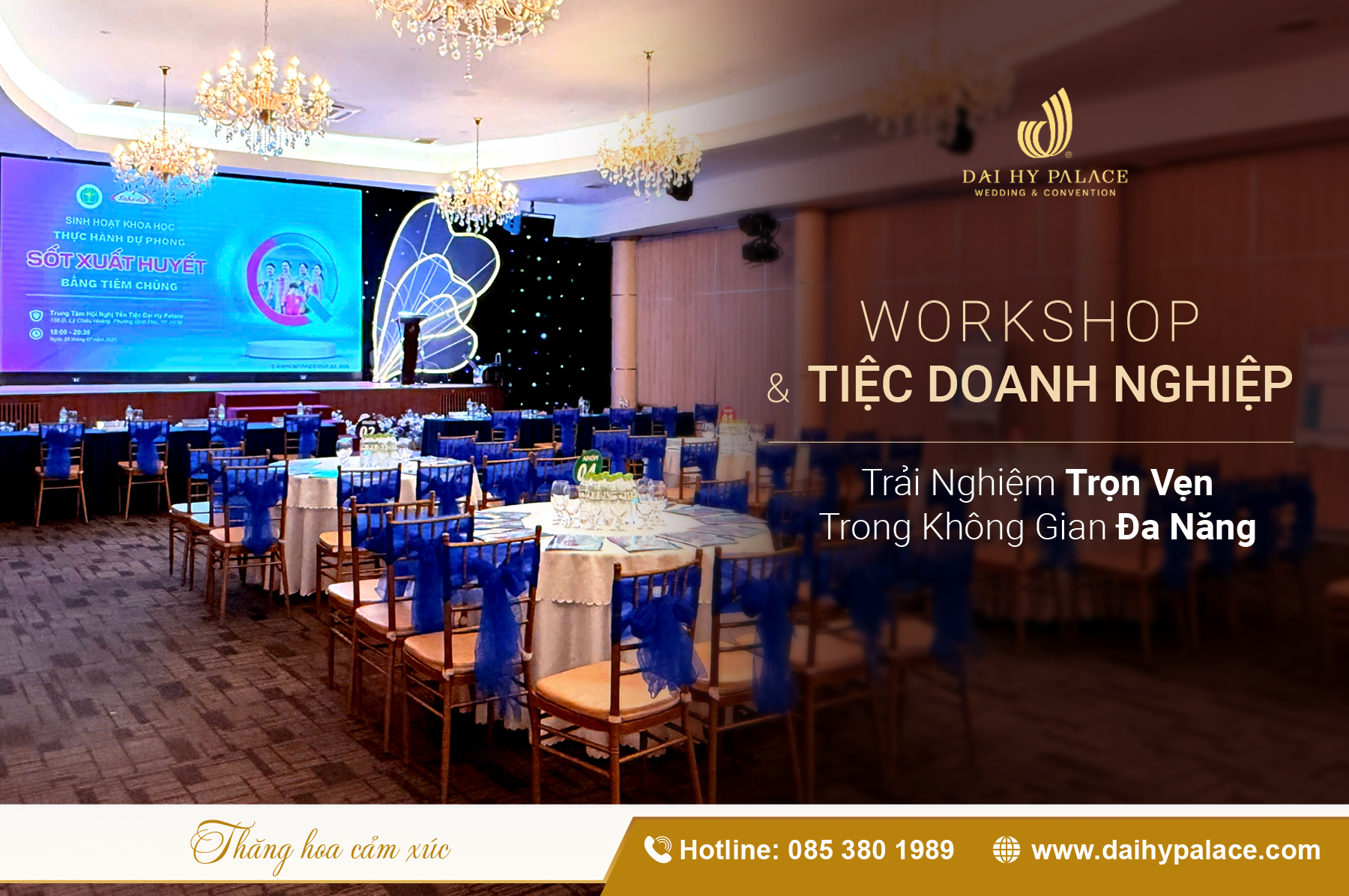 Không gian sang trọng với sức chứa hơn 1.000 khách, trang bị màn hình LED sắc nét, sân khấu và khu vực đón khách rộng rãi cho tiệc hội nghị, hội thảo và các sự kiện doanh nghiệp chuyên nghiệp, hiệu quả.